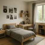 - Regał lub nieduża biblioteczka – z łatwym dostępem do ulubionych lektur.