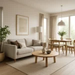 Neutralne tło pozwala na swobodne operowanie mocniejszymi akcentami. Przykładowo, kanapa w odcieniu grafitu i poduszki zdobione złotą nicią wprowadzają wrażenie luksusu, nie przytłaczając przestrzeni.